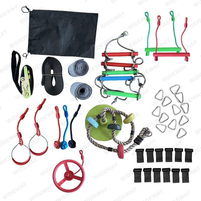 •ຫຼັກສູດອຸປະກອນອຸປະກອນ Ninja ທີ່ນິຍົມສໍາລັບເດັກນ້ອຍດ້ວຍ 15 ມ Slackline ດ້ວຍ Ratchet ສໍາລັບຄວາມມ່ວນກາງແຈ້ງທີ່ບໍ່ມີທີ່ສິ້ນສຸດ.