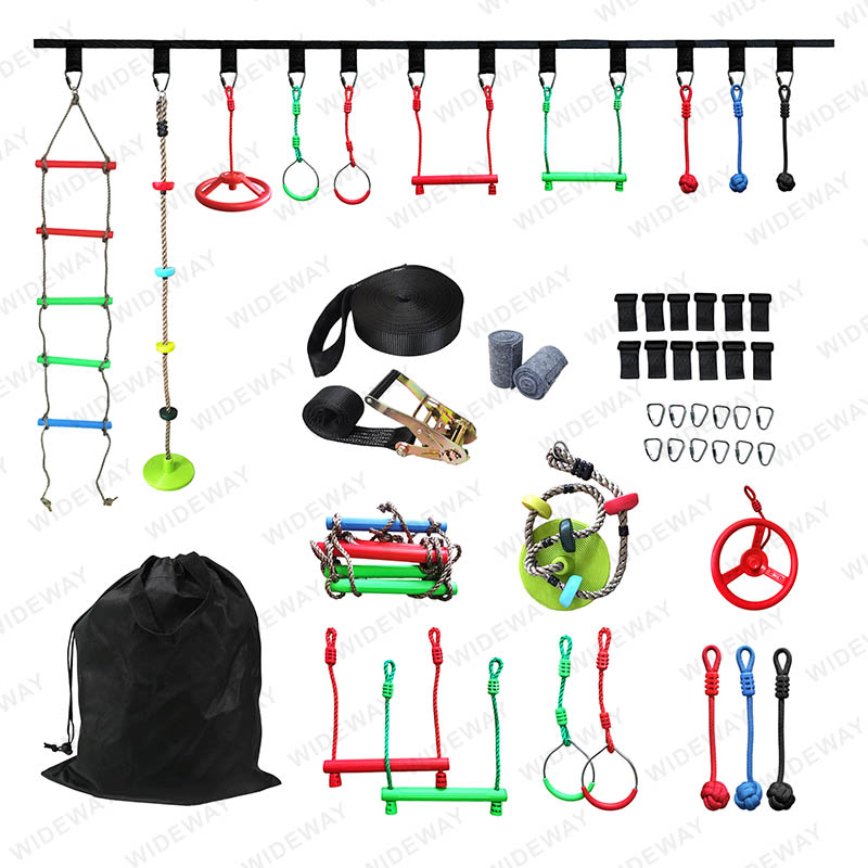 •ປະກອບມີແຖບ trapeze 2pcs, ແຫວນ gymnastic 2pcs, ປີນຂັ້ນໄດ, ແລະຫມຸນລໍ້ Ninja ສໍາລັບປະສົບການການຝຶກອົບຮົມ ninja ທີ່ຫຼາກຫຼາຍ.